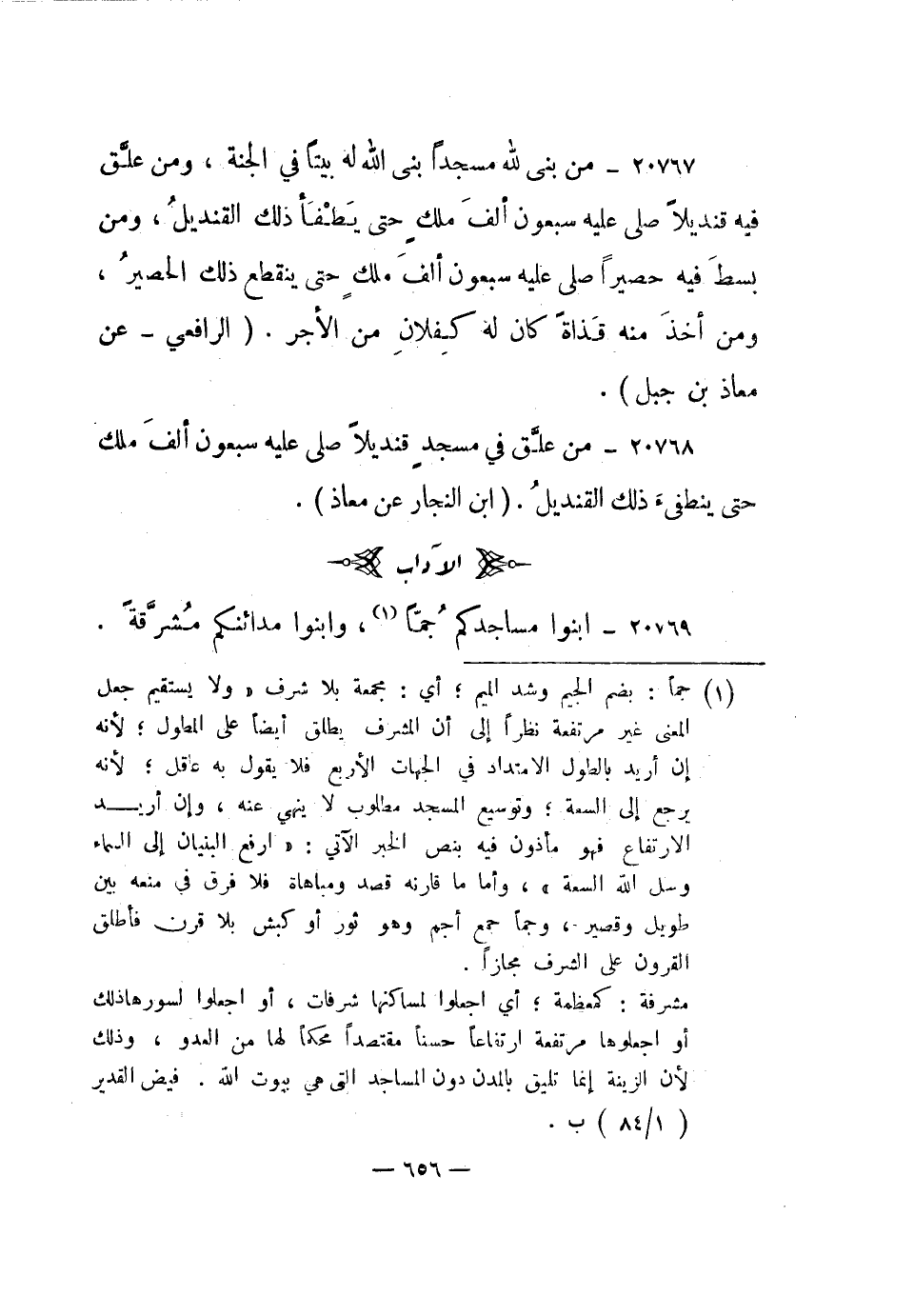 20767- من بنى لله مسجدا بنى الله له بيتا في الجنة، ومن علق فيه قنديلا صلى عليه سبعون ألف ملك حتى يطفأ ذلك القنديل، ومن بسط فيه حصيرا صلى عليه سبعون ألف ملك حتى ينقطع ذلك الحصير، ومن أخذ منه قذاة كان له كفلان من الأجر. "الرافعي - عن معاذ بن جبل".