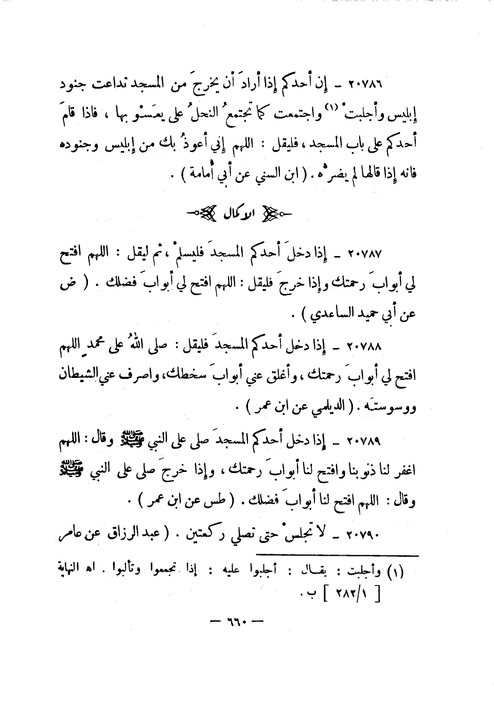 20786- إن أحدكم إذا أراد أن يخرج من المسجد تداعت جنود إبليس وأجلبت1 واجتمعت كما تجتمع النحل على يعسوبها، فإذا قام أحدكم على باب المسجد، فليقل: اللهم إني أعوذ بك من إبليس وجنوده فإنه إذا قالها لم يضره.