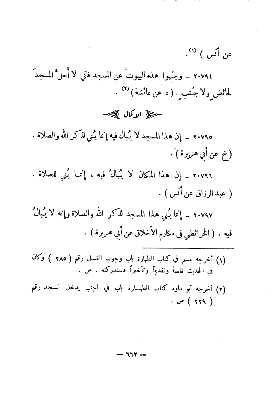 20796- إن هذا المكان لا يبال فيه، إنما بني للصلاة. "عبد الرزاق عن أنس".