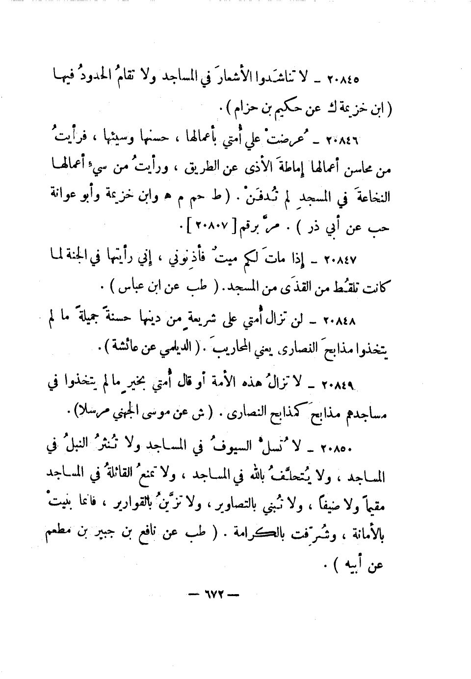 20850- لا تسل السيوف في المساجد ولا تنثر النبل في المساجد، ولا يتحلف بالله في المساجد، ولا تمنع القائلة في المساجد مقيما ولا ضيفا، ولا تبني بالتصاوير، ولا تزين بالقوارير، فإنما بنيت بالأمانة، وشرفت بالكرامة. "طب عن نافع بن جبير بن مطعم عن أبيه".