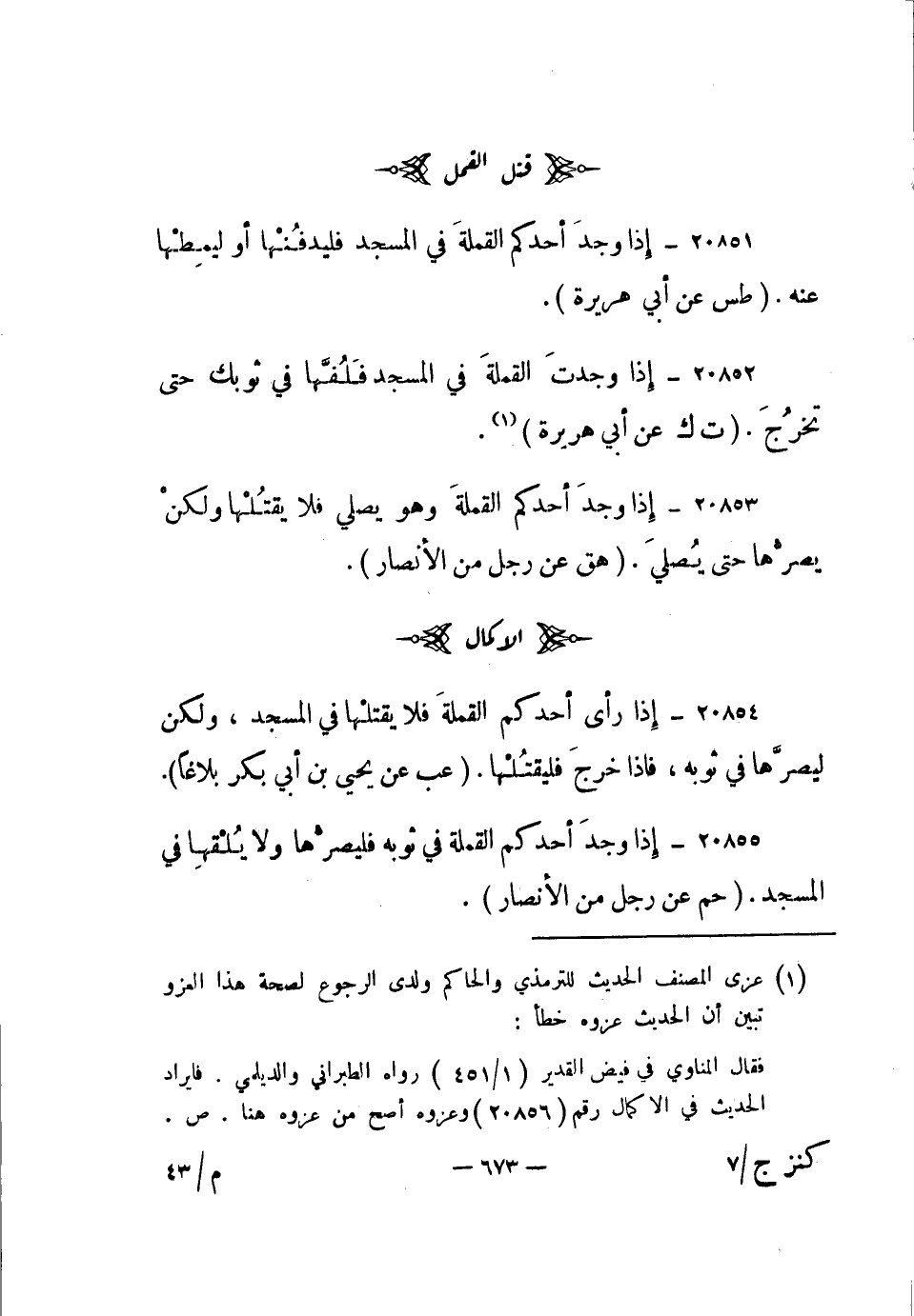 20852- إذا وجدت القملة في المسجد فلفها في ثوبك حتى تخرج. "ت ك عن أبي هريرة"1
