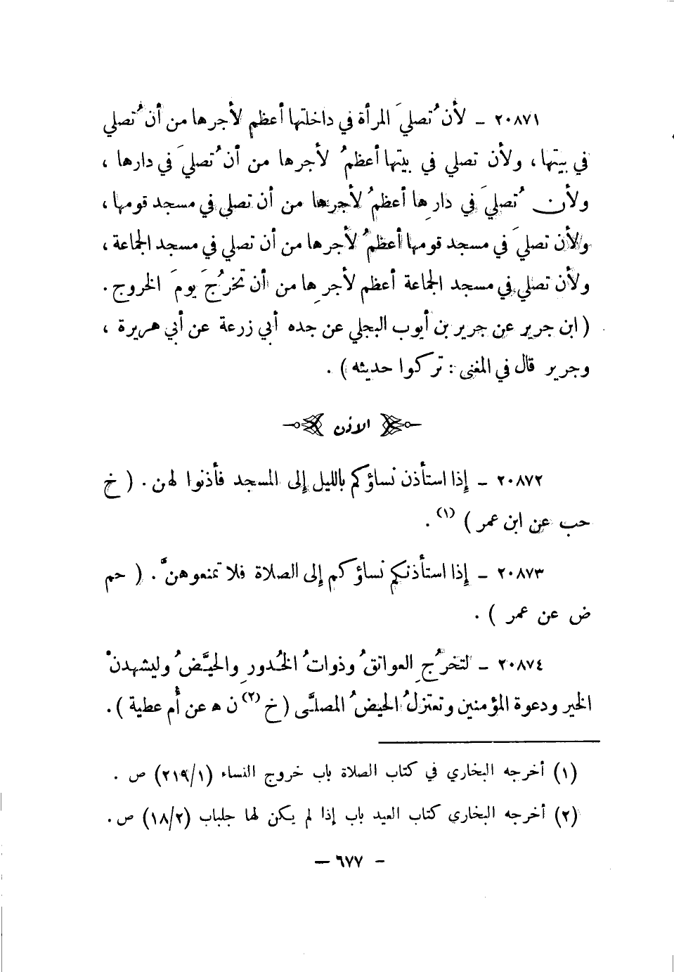 20872- إذا استأذن نساؤكم بالليل إلى المسجد فأذنوا لهن. "خ حب عن ابن عمر"1