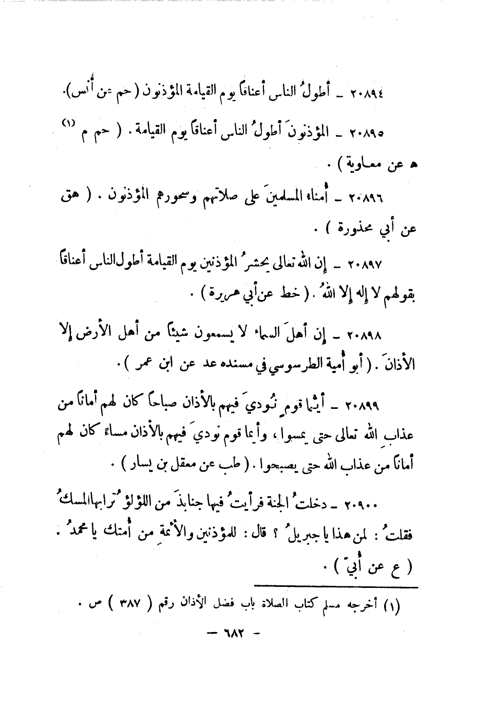 20895- المؤذنون أطول الناس أعناقا يوم القيامة. "حم م1 هـ عن معاوية".