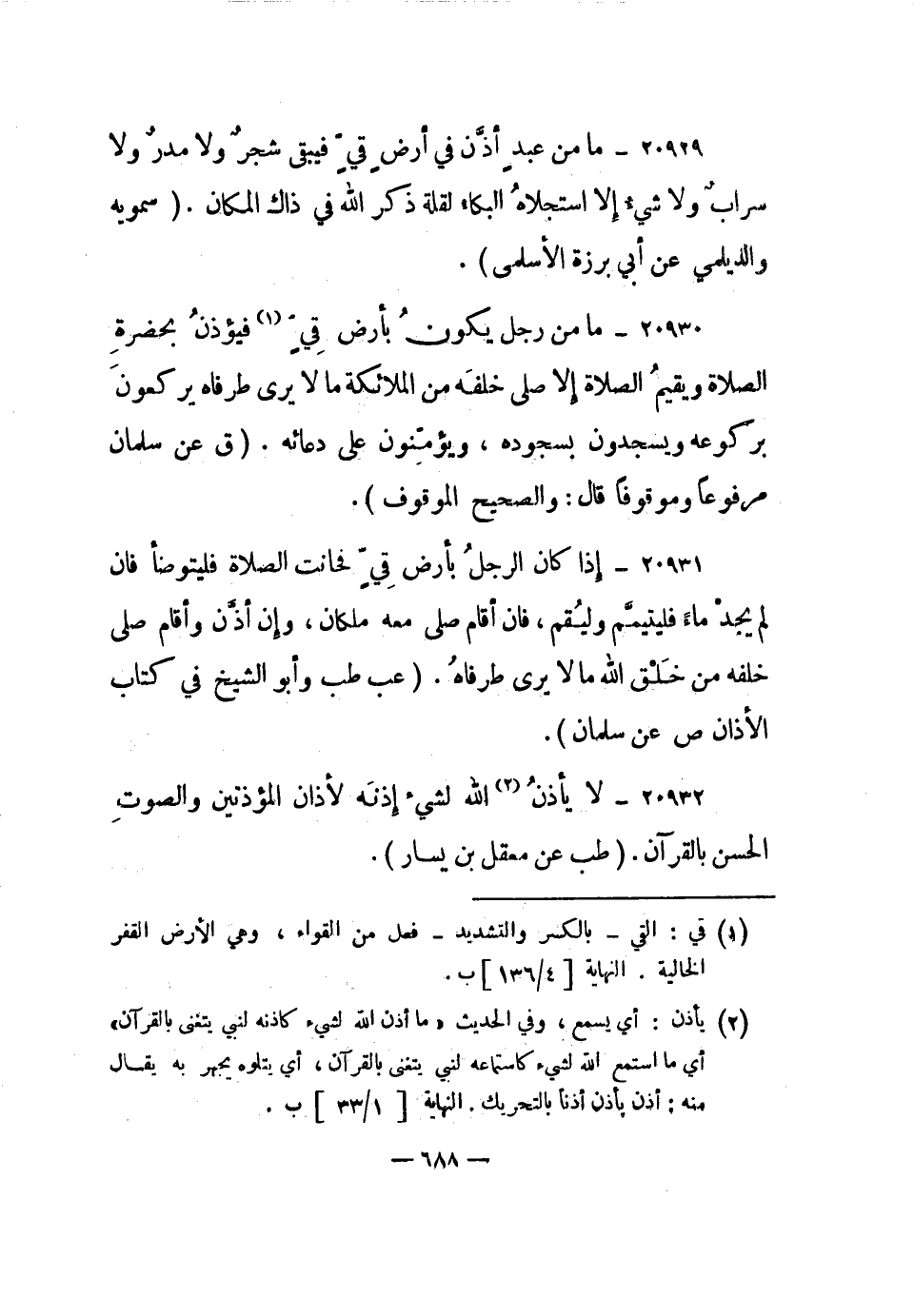 20929- ما من عبد أذن في أرض قي فيبقى شجر ولا مدر ولا سراب ولا شيء إلا استجلاه البكاء لقلة ذكر الله في ذاك المكان. "سمويه والديلمي عن أبي برزة الأسلمي".