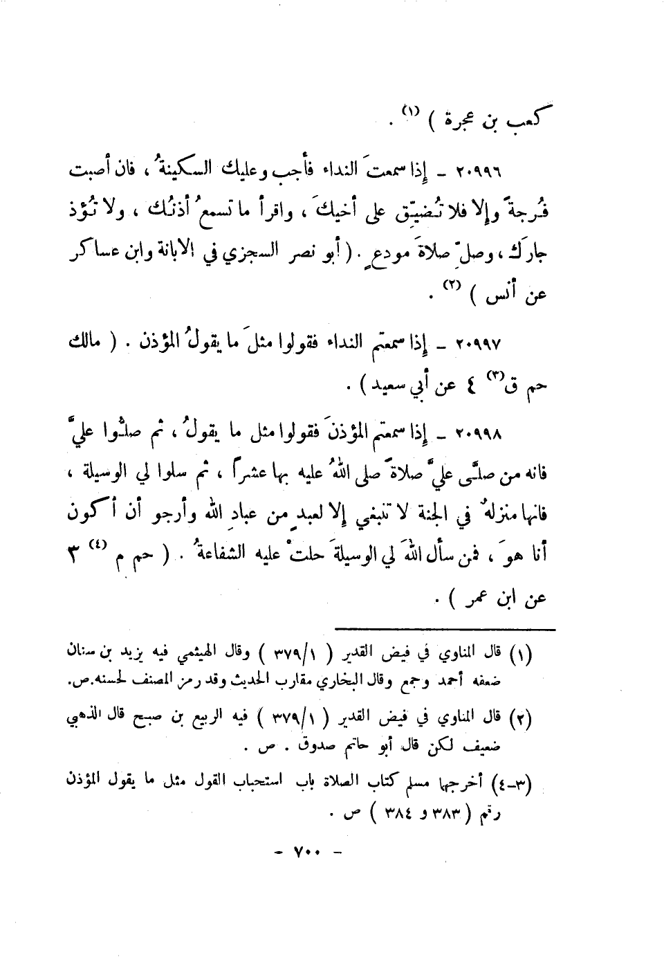 20998- إذا سمعتم المؤذن فقولوا مثل ما يقول، ثم صلوا علي فإنه من صلى علي صلاة صلى الله عليه بها عشرا، ثم سلوا لي الوسيلة، فإنها منزله في الجنة لا تنبغي إلا لعبد من عباد الله وأرجو أن أكون أنا هو، فمن سأل الله لي الوسيلة حلت عليه الشفاعة. "حم م3 3 عن ابن عمر".