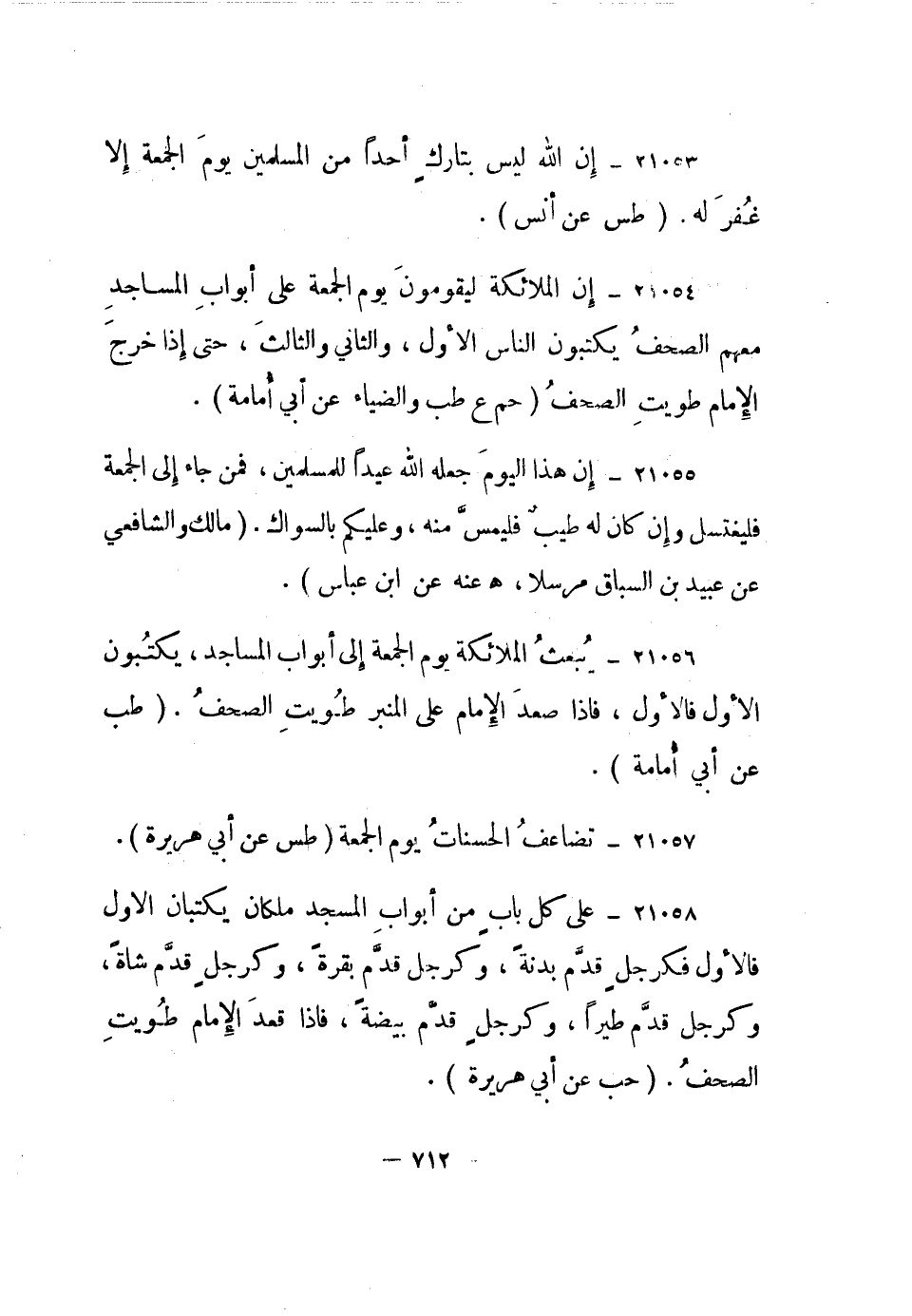 21056- يبعث الملائكة يوم الجمعة إلى أبواب المساجد، يكتبون الأول فالأول، فإذا صعد الإمام على المنبر طويت الصحف. "طب عن أبي أمامة".