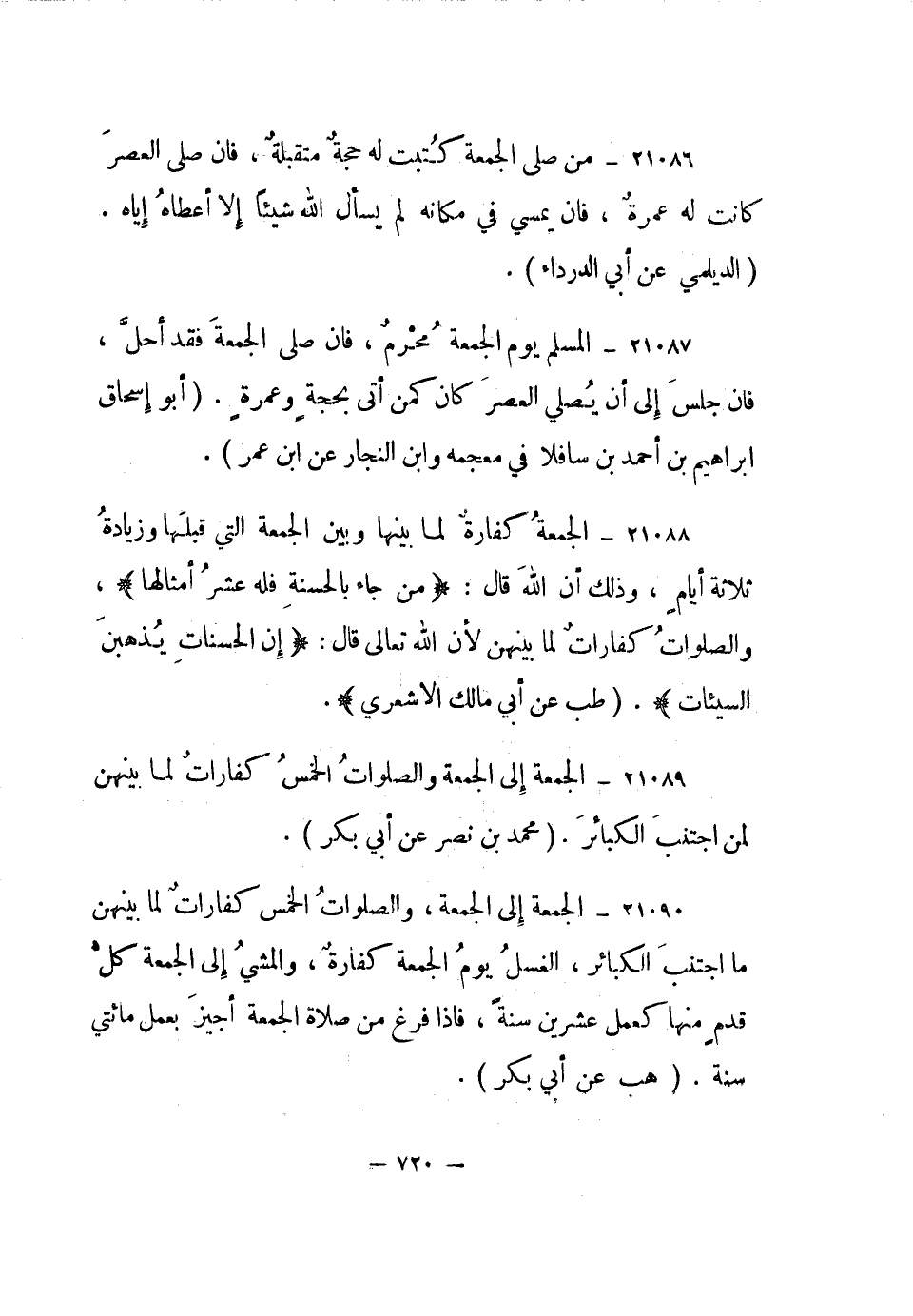 21089- الجمعة إلى الجمعة والصلوات الخمس كفارات لما بينهن لمن اجتنب الكبائر. "محمد بن نصر عن أبي بكر".
