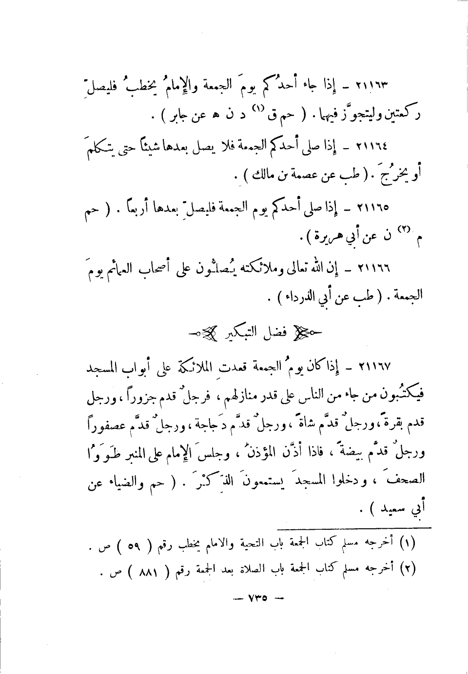 21167- إذا كان يوم الجمعة قعدت الملائكة على أبواب المسجد فيكتبون من جاء من الناس على قدر منازلهم، فرجل قدم جزورا، ورجل قدم بقرة، ورجل قدم شاة، ورجل قدم دجاجة، ورجل قدم عصفورا ورجل قدم بيضة، فإذا أذن المؤذن، وجلس الإمام على المنبر طووا الصحف، ودخلوا المسجد يستمعون الذكر.