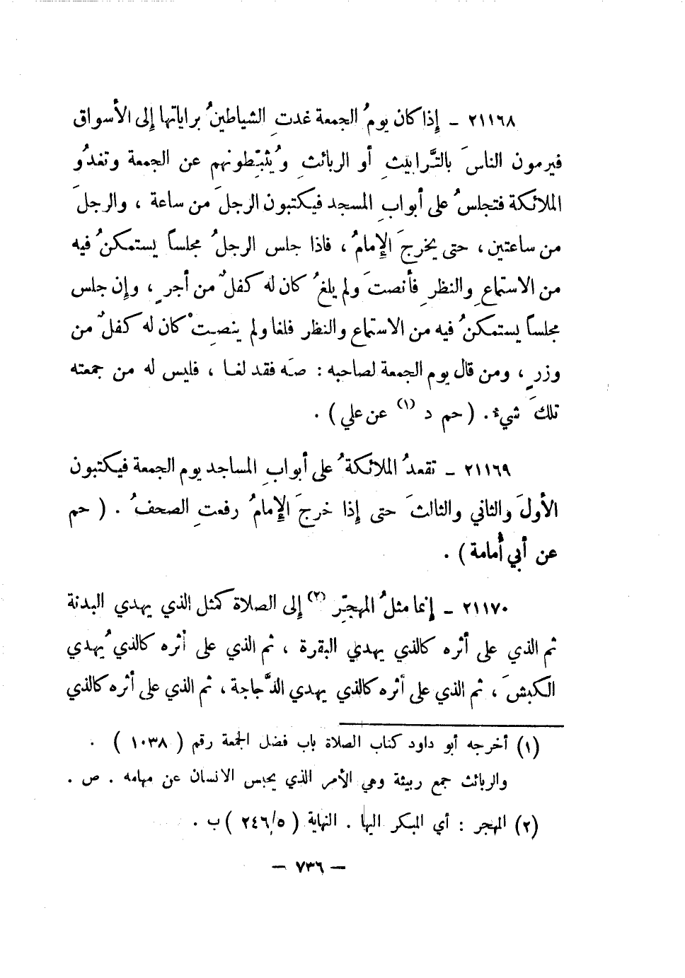21169- تقعد الملائكة على أبواب المساجد يوم الجمعة فيكتبون الأول والثاني والثالث حتى إذا خرج الإمام رفعت الصحف. "حم عن أبي أمامة".