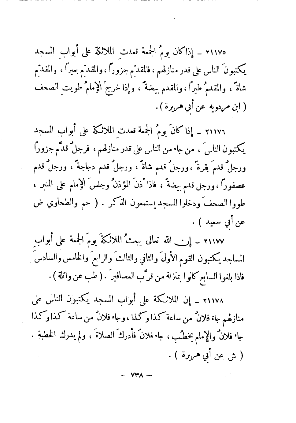21175- إذا كان يوم الجمعة قعدت الملائكة على أبواب المسجد يكتبون الناس على قدر منازلهم، فالمقدم جزورا، والمقدم بعيرا، والمقدم شاة، والمقدم طيرا، والمقدم بيضة، وإذا خرج الإمام طويت الصحف. "ابن مردويه عن أبي هريرة".