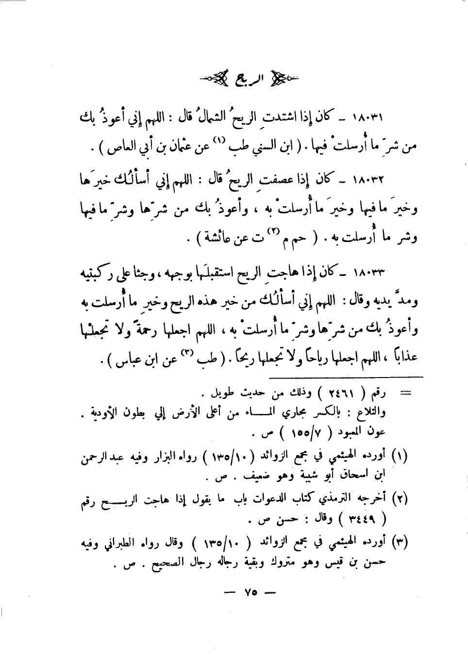18032- كان إذا عصفت الريح قال: اللهم إني أسألك خيرها وخير ما فيها وخير ما أرسلت به، وأعوذ بك من شرها وشر ما فيها وشر ما أرسلت به.