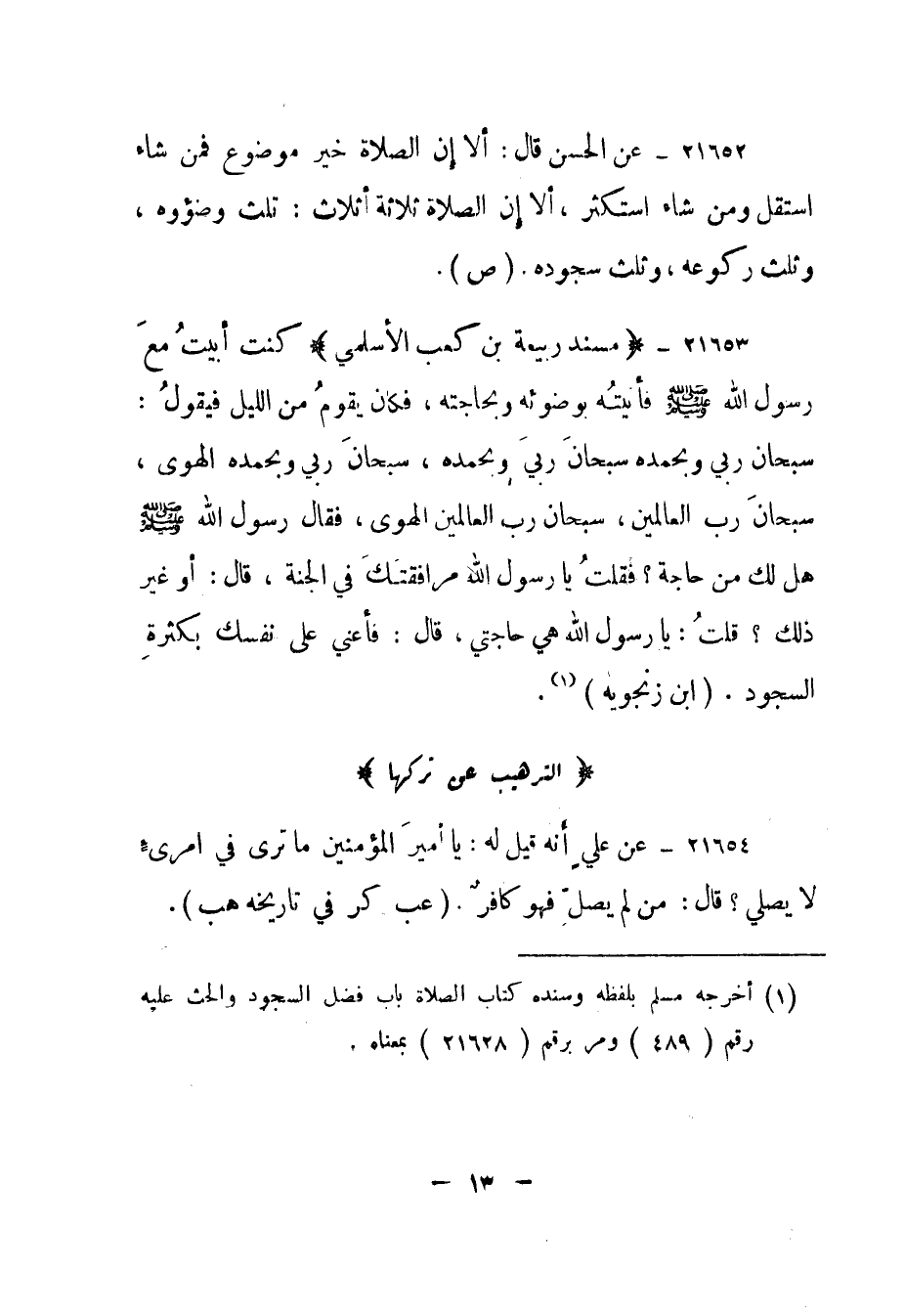 21653- "مسند ربيعة بن كعب الأسلمي" كنت أبيت مع رسول الله صلى الله عليه وسلم فأتيته بوضوئه وبحاجته، فكان يقوم من الليل فيقول: "سبحان ربي وبحمده سبحان ربي وبحمده، سبحان ربي وبحمده الهوى، سبحان رب العالمين، سبحان رب العالمين الهوى"، فقال رسول الله صلى الله عليه وسلم "هل لك من حاجة "؟ فقلت يا رسول الله مرافقتك في الجنة، قال: "أو غير ذلك"؟ قلت: يا رسول الله هي حاجتي، قال: " فأعني على نفسك بكثرة السجود". "ابن زنجويه" 1