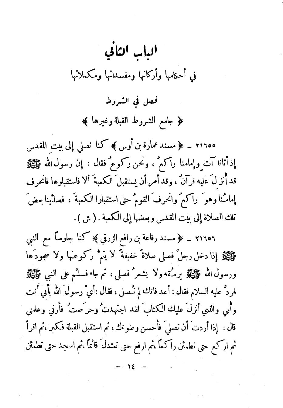 21656- "مسند رفاعة بن أبي رافع الزرقي" "كنا جلوسا مع النبي صلى الله عليه وسلم إذا دخل رجل فصلى صلاة خفيفة لا يتم ركوعها ولا سجودها ورسول الله صلى الله عليه وسلم يرمقه ولا يشعر فصلى، ثم جاء فسلم على النبي صلى الله عليه وسلم فرد عليه السلام فقال: "أعد فإنك لم تصل"، فقال: أي رسول الله بأبي أنت وأمي والذي أنزل عليك الكتاب لقد اجتهدت وحرصت فأرني وعلمني قال: "إذا أردت أن تصلي فأحسن وضوءك، ثم استقبل القبلة فكبر، ثم اقرأ ثم اركع حتى تطمئن راكعا، ثم ارفع حتى تعتدل قائما، ثم اسجد حتى تطمئن