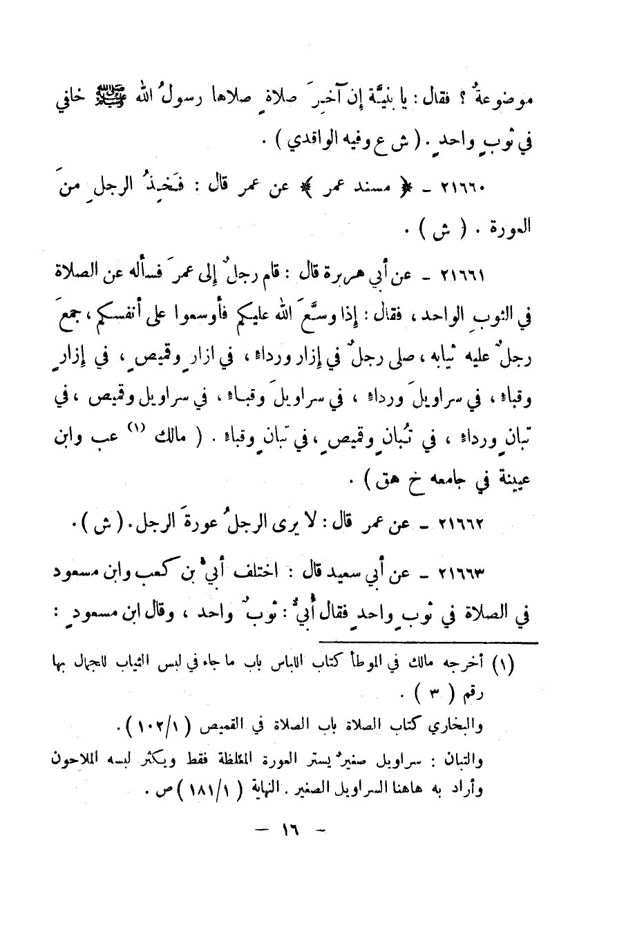 21661- عن أبي هريرة قال: "قام رجل إلى عمر فسأله عن الصلاة في الثوب الواحد، فقال: إذا وسع الله عليكم فأوسعوا على أنفسكم، جمع رجل عليه ثيابه، صلى رجل في إزار ورداء، في إزار وقميص، في إزار وقباء، في سراويل ورداء، في سراويل وقباء، في سراويل وقميص، في تبان ورداء، في تبان وقميص، في تبان وقباء". "مالك 1 عب وابن عيينة في جامعه خ هق".
