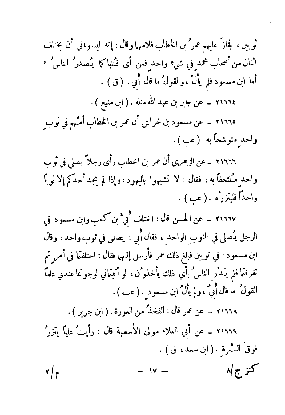 21666- عن الزهري أن عمر بن الخطاب رأى رجلا يصلي في ثوب واحد ملتحفا به، فقال: "لا تشبهوا باليهود، وإذا لم يجد أحدكم إلا ثوبا واحدا فليتزره". "عب".