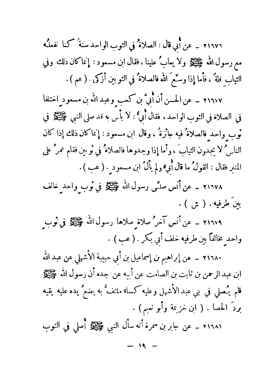 21676- عن أبي قال: "الصلاة في الثوب الواحد سنة كنا نفعله مع رسول الله صلى الله عليه وسلم ولا يعاب علينا"، فقال ابن مسعود: "إنما كان ذلك وفي الثياب قلة، فأما إذا وسع الله فالصلاة في الثوبين أزكى". "عم".