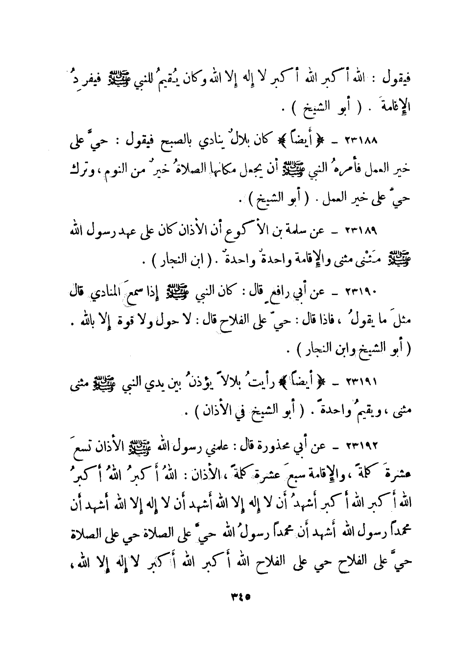 23191- (أيضا) رأيت بلالا يؤذن بين يدي النبي صلى الله عليه وسلم مثنى مثنى، ويقيم واحدة. (أبو الشيخ في الأذان) .