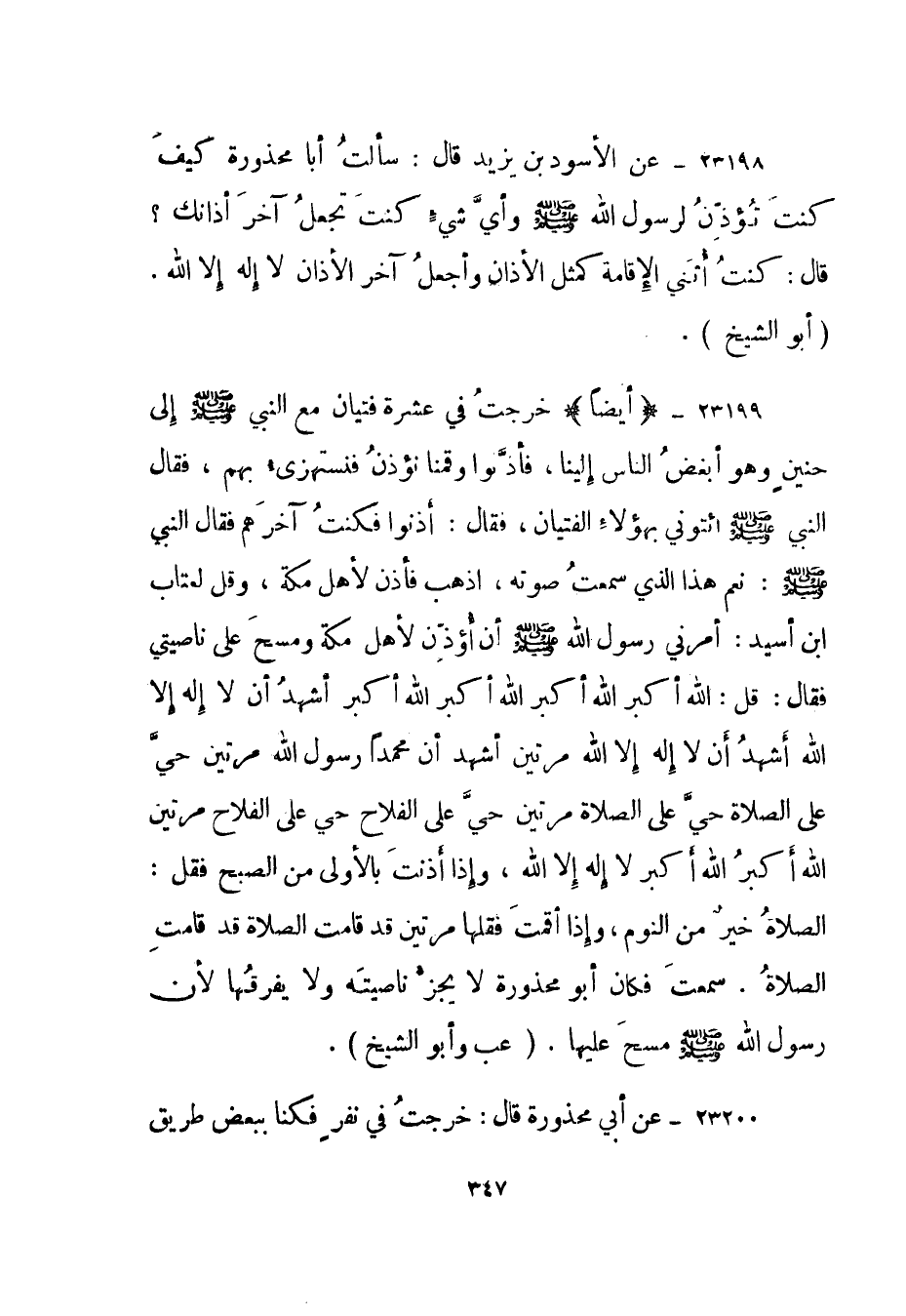 23198- عن الأسود بن يزيد قال: "سألت أبا محذورة كيف كنت تؤذن لرسول الله صلى الله عليه وسلم وأي شيء كنت تجعل آخر أذانك؟ " قال: "كنت أثني الإقامة كمثل الأذان وأجعل آخر الأذان لا إله إلا الله". (أبو الشيخ) .