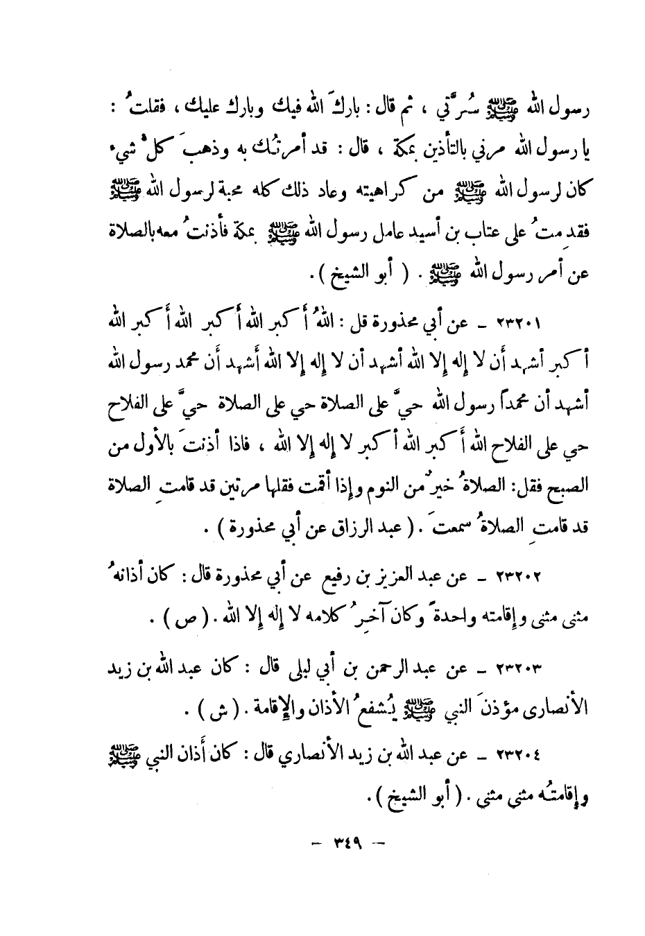 23203- عن عبد الرحمن بن أبي ليلى قال: "كان عبد الله بن زيد الأنصاري مؤذن النبي صلى الله عليه وسلم يشفع الأذان والإقامة". (ش) .