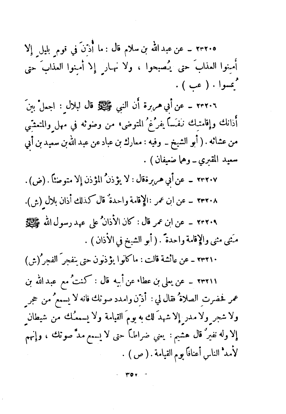 23209- عن ابن عمر قال: "كان الأذان على عهد رسول الله صلى الله عليه وسلم مثنى مثنى والإقامة واحدة". (أبو الشيخ في الأذان) .