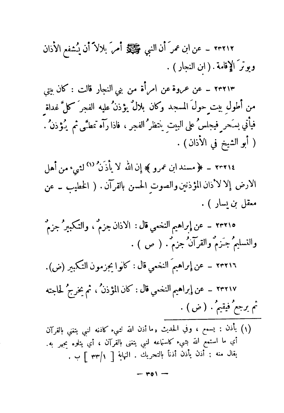 23215- عن إبراهيم النخعي قال: "الأذان جزم، والتكبير جزم والتسليم جزم والقرآن جزم". (ص) .