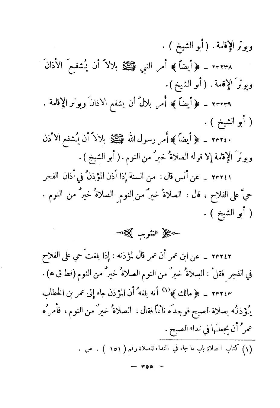 23243- (مالك) (1) أنه بلغه أن المؤذن جاء إلى عمر بن الخطاب يؤذنه بصلاة الصبح فوجده نائما فقال: الصلاة خير من النوم، فأمره عمر أن يجعلها في نداء الصبح.