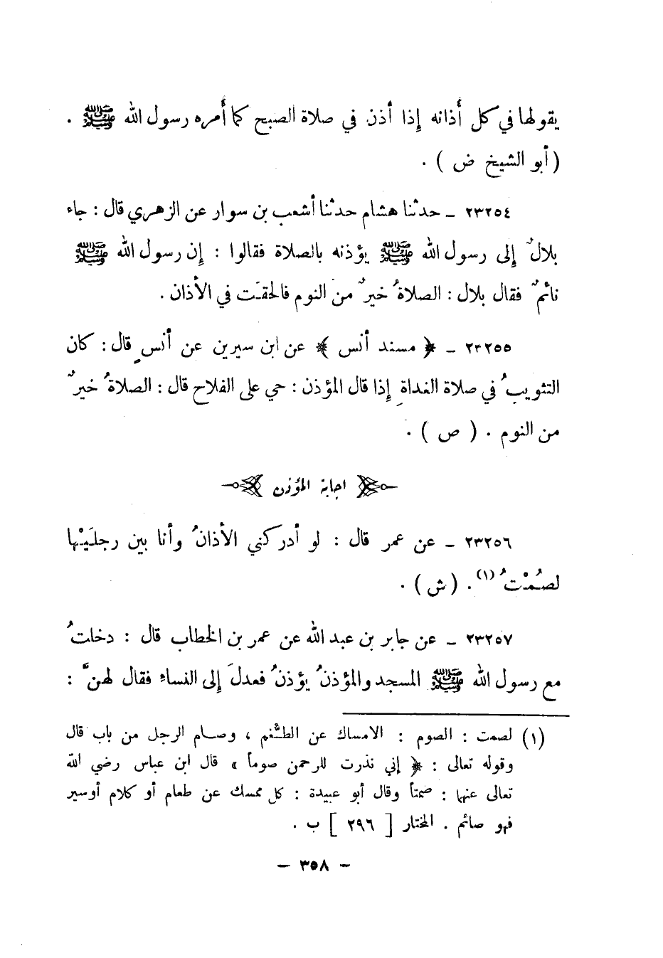 23254- حدثنا هشام حدثنا أشعب بن سوار عن الزهري قال: "جاء بلال إلى رسول الله صلى الله عليه وسلم يؤذنه بالصلاة فقالوا: إن رسول الله صلى الله عليه وسلم نائم فقال بلال: الصلاة خير من النوم فألحقت في الأذان".