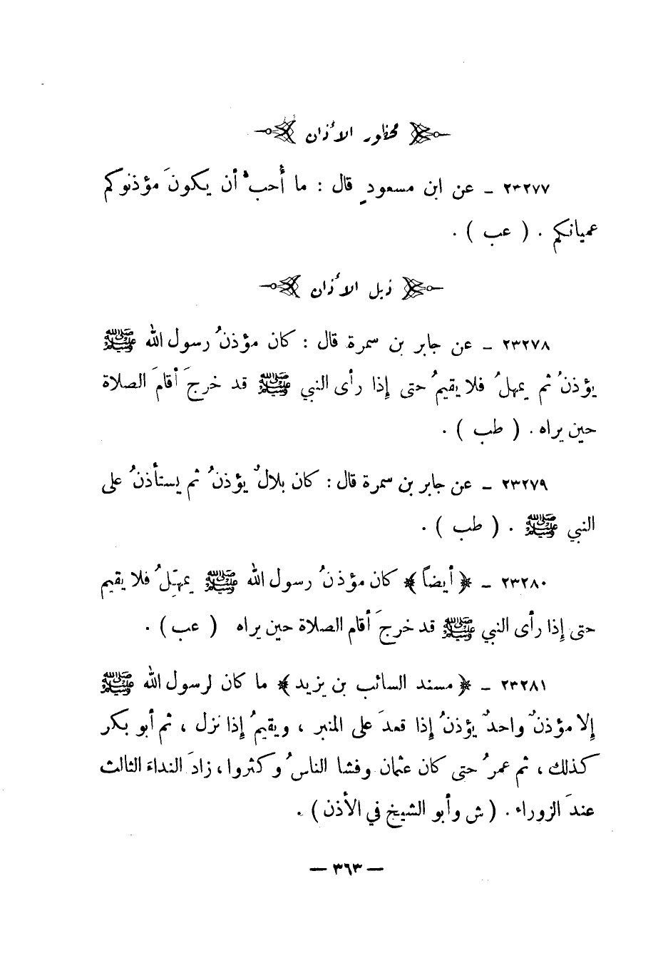 23281- (مسند السائب بن يزيد) ما كان لرسول الله صلى الله عليه وسلم إلا مؤذن واحد يؤذن إذا قعد على المنبر، ويقيم إذا نزل، ثم أبو بكر كذلك، ثم عمر حتى كان عثمان وفشا الناس وكثروا، زاد النداء الثالث عند الزوراء. (ش وأبو الشيخ في الأذان) .