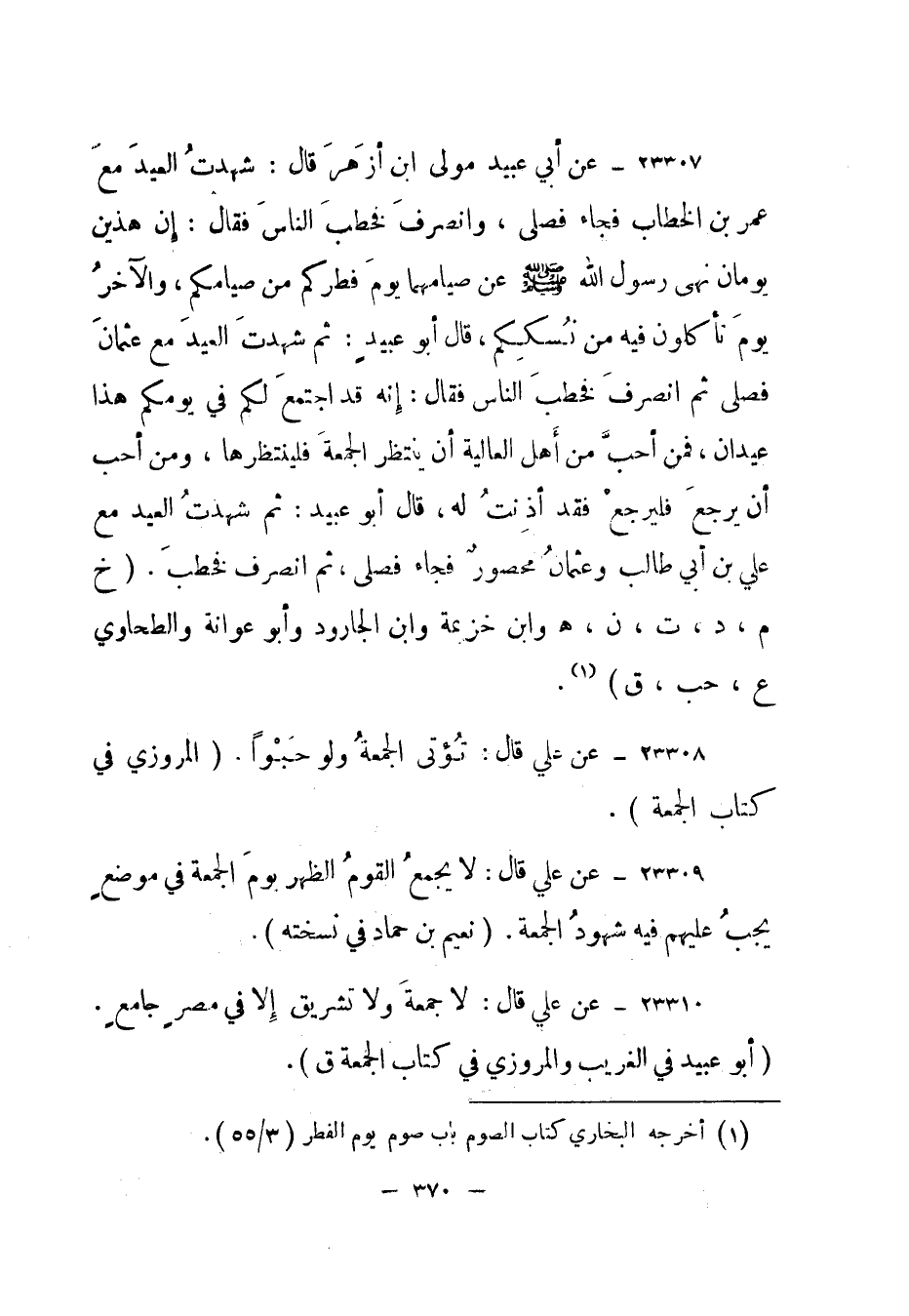 23307- عن أبي عبيد مولى ابن الأزهر قال: "شهدت العيد مع عمر بن الخطاب فجاء فصلى، وانصرف فخطب الناس فقال: إن هذين يومان نهى رسول الله صلى الله عليه وسلم عن صيامهما يوم فطركم من صيامكم، والآخر يوم تأكلون فيه من نسككم،" قال أبو عبيد: "ثم شهدت العيد مع عثمان فصلى ثم انصرف فخطب الناس فقال: إنه قد اجتمع لكم في يومكم هذا عيدان، فمن أحب من أهل العالية أن ينتظر الجمعة فلينتظرها، ومن أحب أن يرجع فليرجع فقد أذنت له،" قال أبو عبيد: "ثم شهدت العيد مع علي بن أبي طالب وعثمان محصور فجاء فصلى، ثم انصرف فخطب". (خ م، د، ت، ن، هـ وابن خزيمة وابن الجارود وأبو عوانة والطحاوي ع، حب، ق) (1)