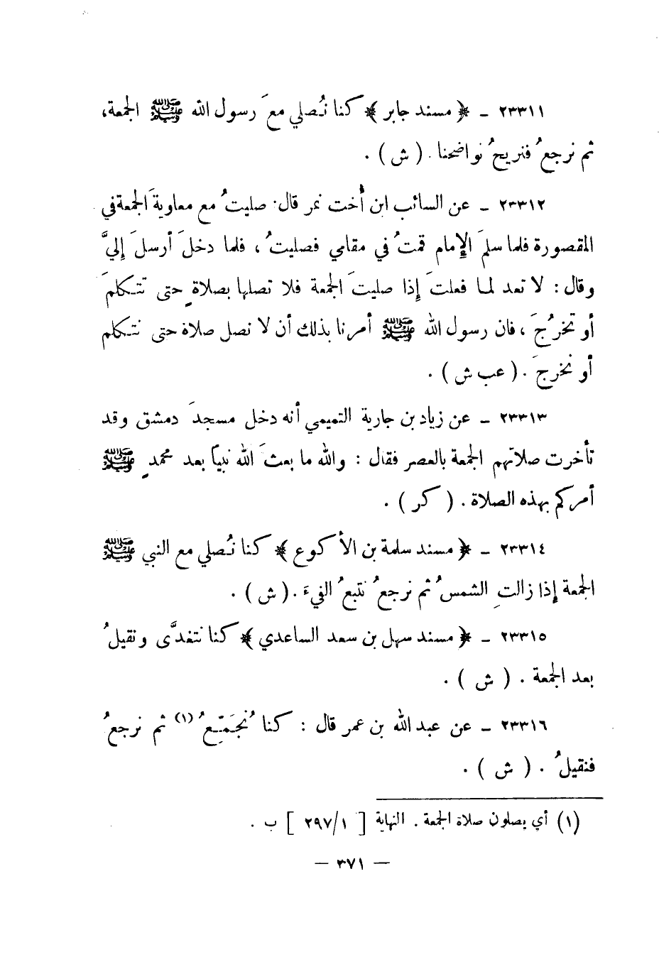 23314- (مسند سلمة بن الأكوع) كنا نصلي مع النبي صلى الله عليه وسلم الجمعة إذا زالت الشمس ثم نرجع نتبع الفيء. (ش) .