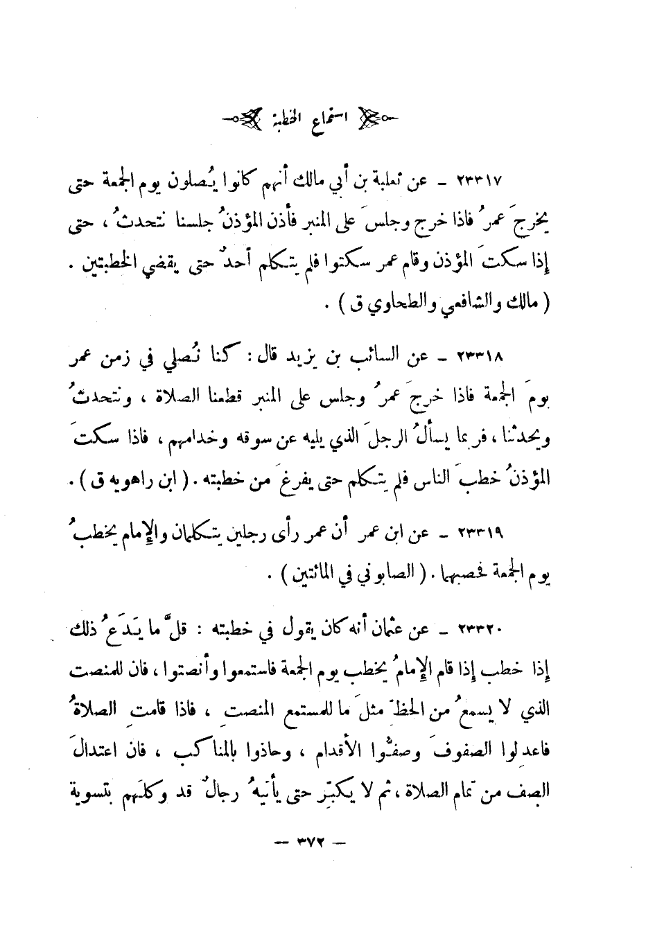 23318- عن السائب بن يزيد قال: "كنا نصلي في زمن عمر يوم الجمعة فإذا خرج عمر وجلس على المنبر قطعنا الصلاة، ونتحدث ويحدثنا، فربما يسأل الرجل الذي يليه عن سوقه وخدامهم، فإذا سكت المؤذن خطب الناس فلم يتكلم حتى يفرغ من خطبته". (ابن راهويه ق) .