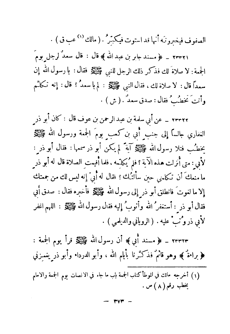 23322- عن أبي سلمة بن عبد الرحمن بن عوف قال: "كان أبو ذر الغفاري جالسا إلى جنب أبي بن كعب يوم الجمعة ورسول الله صلى الله عليه وسلم يخطب فتلا رسول الله صلى الله عليه وسلم آية لم يكن أبو ذر سمعها: فقال أبو ذر لأبي: متى أنزلت هذه الآية؟ فلم يكلمه، فلما أقيمت الصلاة قال له أبو ذر ما منعك أن تكلمني حين سألتك؟ فقال له أبي إنه ليس لك من جمعتك إلا ما لغوت فانطلق أبو ذر إلى رسول الله صلى الله عليه وسلم فأخبره فقال: صدق أبي فقال أبو ذر: أستغفر الله وأتوب إليه فقال رسول الله صلى الله عليه وسلم: اللهم اغفر لأبي ذر وتب عليه". (الروياني والديلمي) .