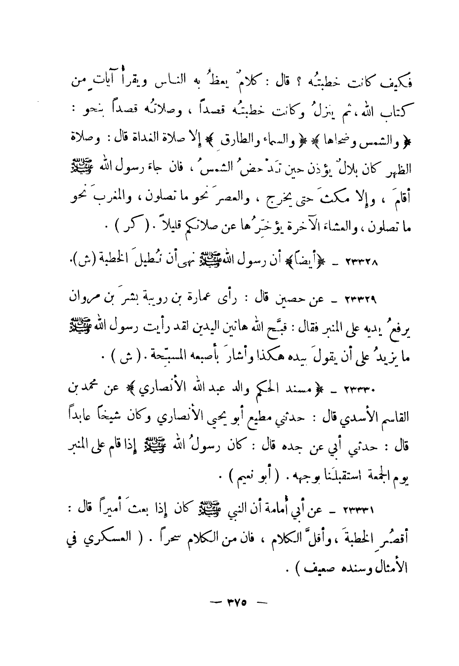 23331- عن أبي أمامة أن النبي صلى الله عليه وسلم كان إذا بعث أميرا قال: "أقصر الخطبة، وأقل الكلام، فان من الكلام سحرا". (العسكري في الأمثال وسنده ضعيف) .