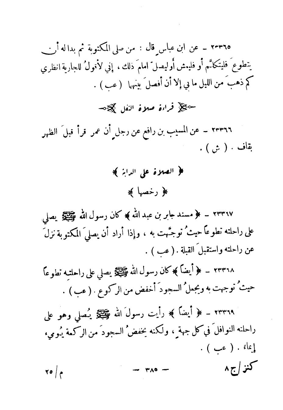23369- (أيضا) رأيت رسول الله صلى الله عليه وسلم يصلي وهو على راحلته النوافل في كل جهة، ولكنه يخفض السجود من الركعة يوميء إيماء. (عب) .