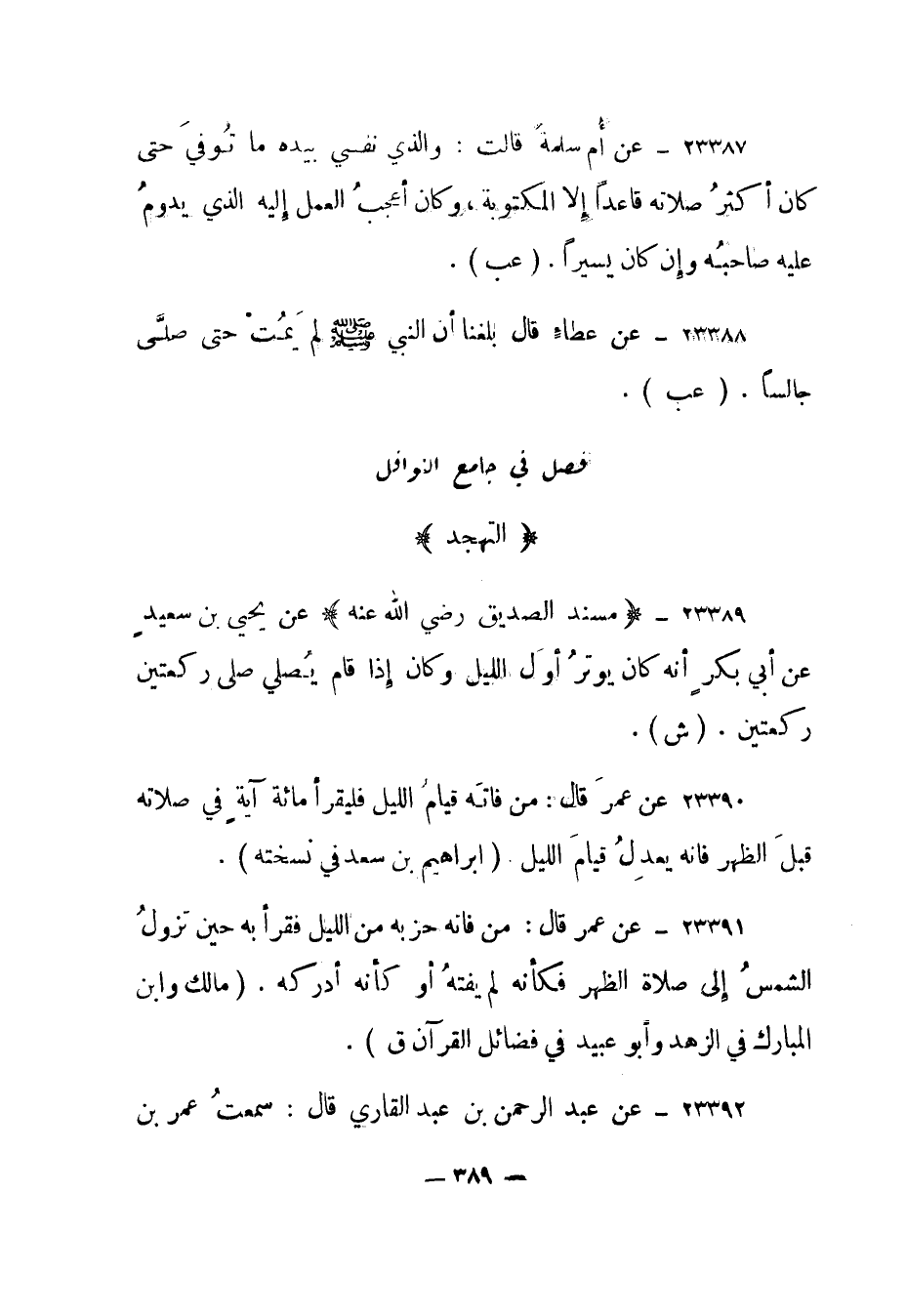 23390- عن عمر قال: "من فاته قيام الليل فليقرأ مائة آية في صلاته قبل الظهر فإنه يعدل قيام الليل". (إبراهيم بن سعد في نسخته) .