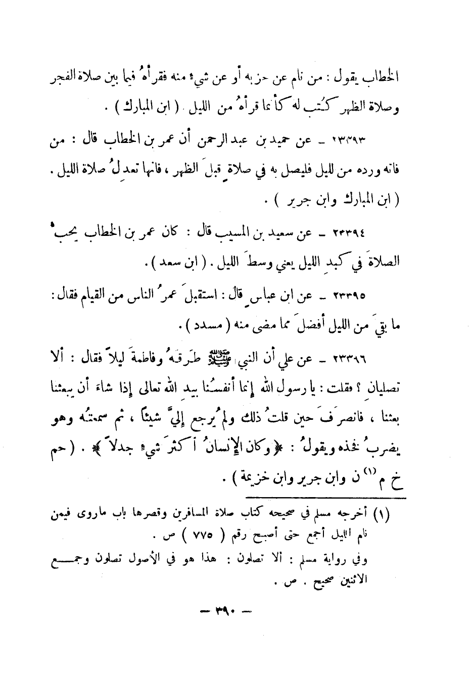 23394- عن سعيد بن المسيب قال: "كان عمر بن الخطاب يحب الصلاة في كبد الليل يعني وسط الليل". (ابن سعد) .