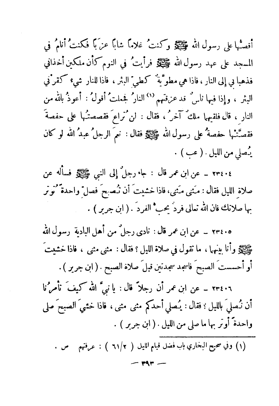 23405- عن ابن عمر قال: "نادى رجل من أهل البادية رسول الله صلى الله عليه وسلم وأنا بينهما، ما تقول في صلاة الليل؟ فقال: مثنى مثنى، فإذا خشيت أو أحسست الصبح فاسجد سجدتين قبل صلاة الصبح". (ابن جرير) .