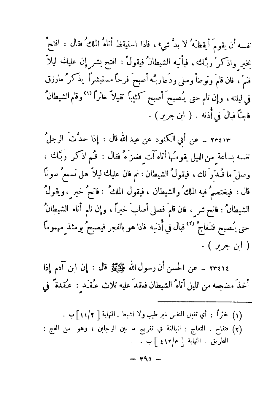 23413- عن أبي الكنود عن عبد الله قال: "إذا حدث الرجل نفسه بساعة من الليل يقومها أتاه آت فغمزه فقال: قم اذكر ربك، وصل ما قدر لك، فيقول الشيطان: نم فإن عليك ليلا هل تسمع صوتا" قال: "فيختصم فيه الملك والشيطان، فيقول الملك: فاتح خير، ويقول الشيطان: فاتح شر، فإن قام فصلى أصاب خيرا، وإن نام أتاه الشيطان حتى يصبح فتفاج (2) فبال في أذنيه فإذا هو بالفجر فيصبح يومئذ مهموما. (ابن جرير) .