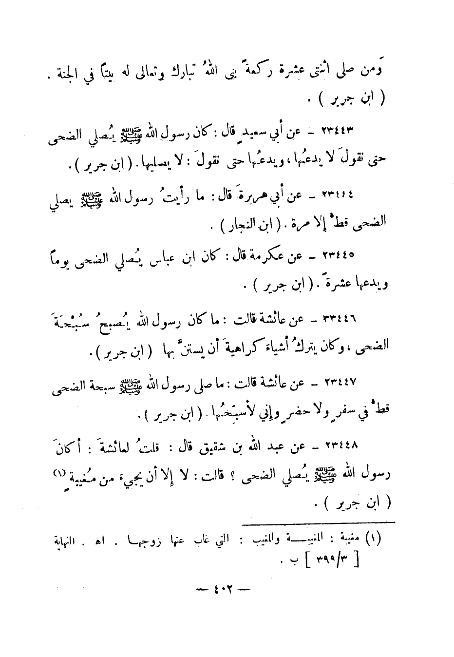 23448- عن عبد الله بن شقيق قال: "قلت لعائشة: أكان رسول الله صلى الله عليه وسلم يصلي الضحى؟ قالت: لا إلا أن يجيء من مغيبة (1) (ابن جرير) .