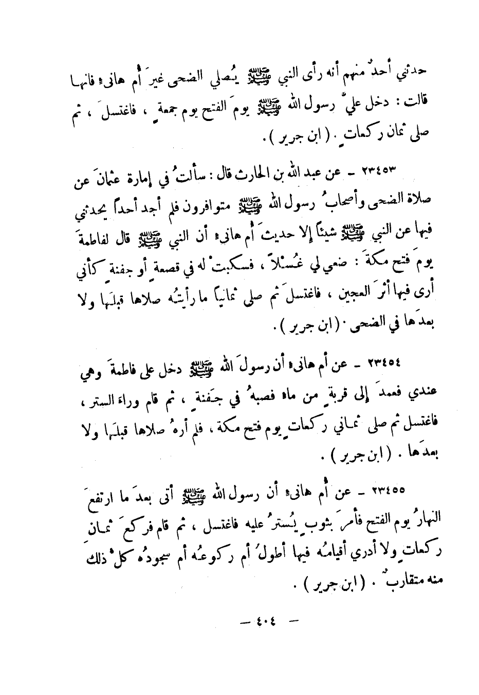 23453- عن عبد الله بن الحارث قال: "سألت في إمارة عثمان عن صلاة الضحى وأصحاب رسول الله صلى الله عليه وسلم متوافرون فلم أجد أحدا يحدثني فيها عن النبي صلى الله عليه وسلم شيئا إلا حديث أم هانئ أن النبي صلى الله عليه وسلم" قال لفاطمة يوم فتح مكة: "ضعي لي غسلا، فسكبت له في قصعة أو جفنة كأني أرى فيها أثر العجين، فاغتسل ثم صلى ثمانيا ما رأيته صلاها قبلها ولا بعدها في الضحى". (ابن جرير) .