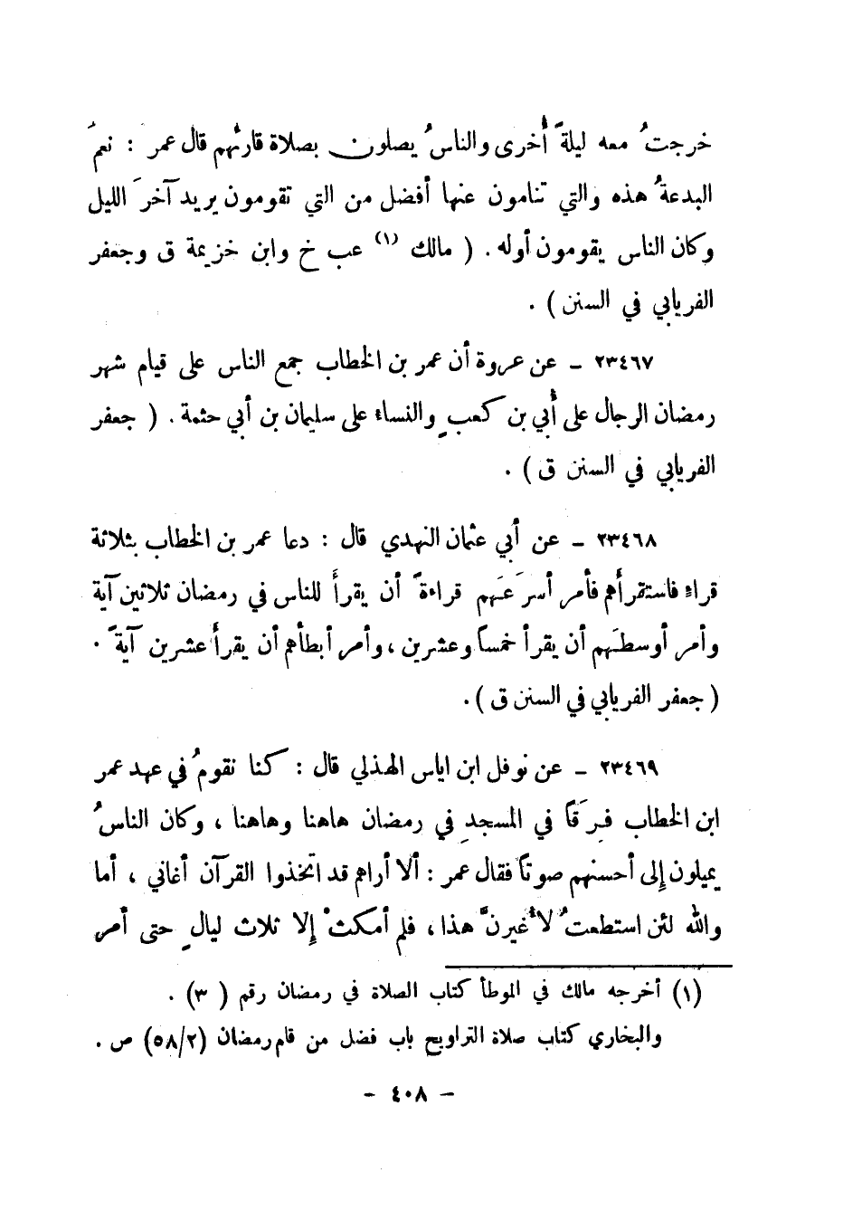 (1) أخرجه مالك في الموطأ كتاب الصلاة في رمضان رقم (3) . والبخاري كتاب صلاة التراويح باب فضل من قام رمضان (2/58) ص