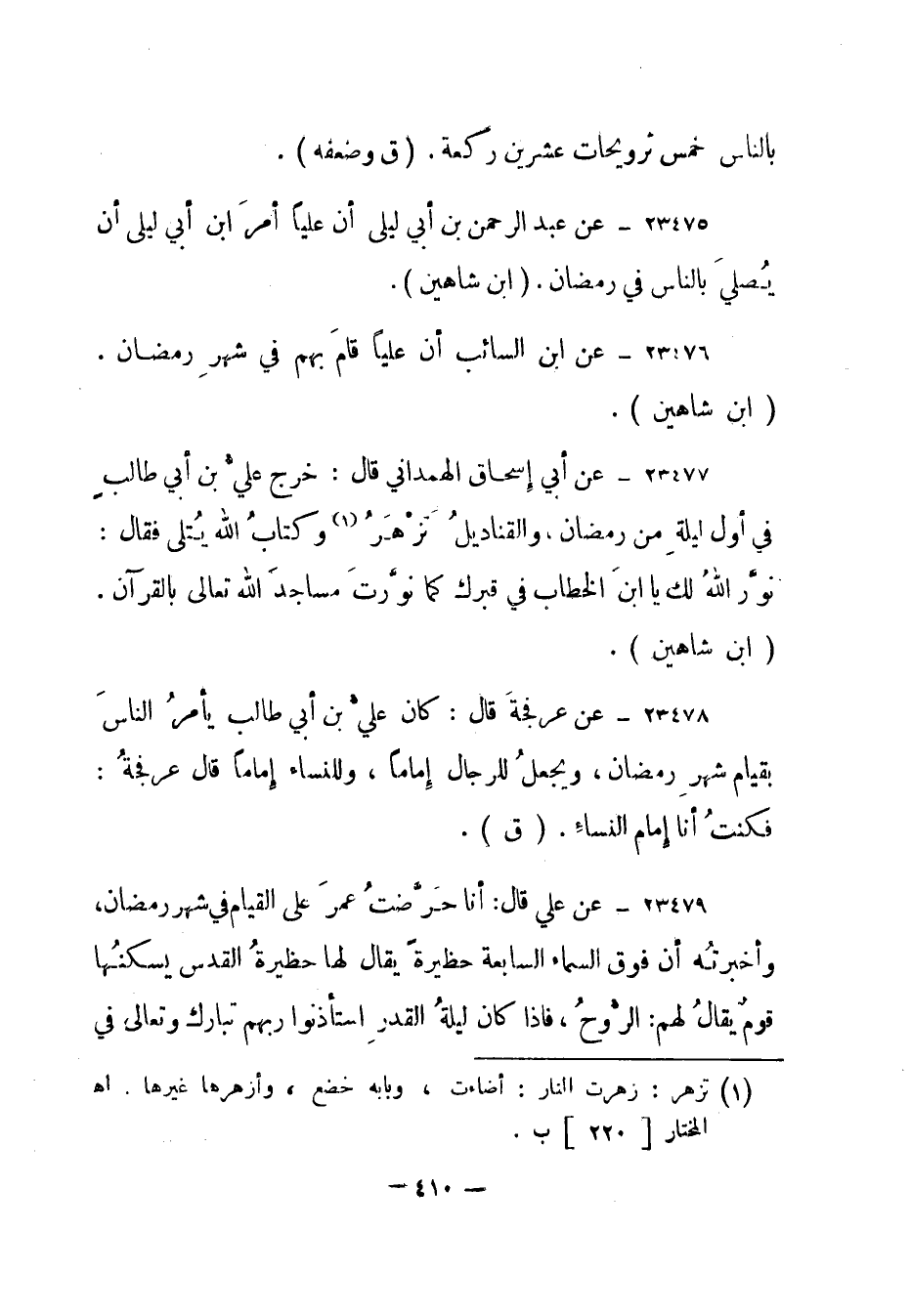 23477- عن أبي إسحاق الهمداني قال: "خرج علي بن أبي طالب في أول ليلة من رمضان، والقناديل تزهر (1) وكتاب الله يتلى فقال: نور الله لك يا ابن الخطاب في قبرك كما نورت مساجد الله تعالى بالقرآن. (ابن شاهين) .