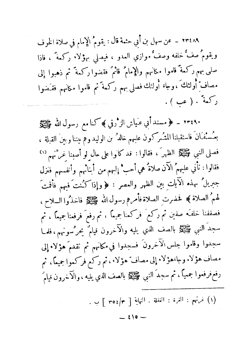 23490- (مسند أبي عياش الزرقي) كنا مع رسول الله صلى الله عليه وسلم بعسفان فاستقبلنا المشركون عليهم خالد بن الوليد وهم بيننا وبين القبلة، فصلى النبي صلى الله عليه وسلم الظهر، فقالوا: قد كانوا على حال لو أصبنا غرتهم (1) فقالوا: تأتي عليهم الآن صلاة هي أحب إليهم من أبنائهم وأنفسهم فنزل جبريل بهذه الآيات بين الظهر والعصر: {وَإِذَا كُنْتَ فِيهِمْ فَأَقَمْتَ لَهُمُ الصَّلاةَ} فحضرت الصلاة فأمرهم رسول الله صلى الله عليه وسلم فأخذوا السلاح، فصففنا خلفه صفين ثم ركع فركعنا جميعا، ثم رفع فرفعنا جميعا، ثم سجد النبي صلى الله عليه وسلم بالصف الذي يليه والآخرون قيام يحرسونهم، فلما سجدوا وقاموا جلس الآخرون فسجدوا في مكانهم ثم تقدم هؤلاء إلى مصاف هؤلاء وجاء هؤلاء إلى مصاف هؤلاء، ثم ركع فركعوا جميعا، ثم رفع فرفعوا جميعا، ثم سجد النبي صلى الله عليه وسلم بالصف الذي يليه، والآخرون قيام