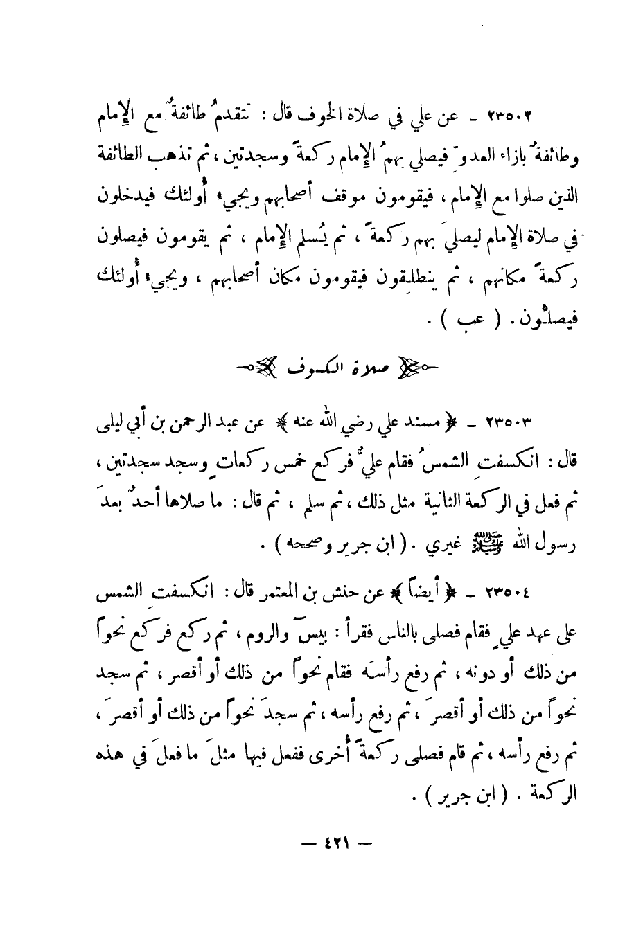 23503- (مسند علي رضي الله عنه) عن عبد الرحمن بن أبي ليلى قال: "انكسفت الشمس فقام علي فركع خمس ركعات وسجد سجدتين، ثم فعل في الركعة الثانية مثل ذلك، ثم سلم،" ثم قال: "ما صلاها أحد بعد رسول الله صلى الله عليه وسلم غيري". (ابن جرير وصححه) .