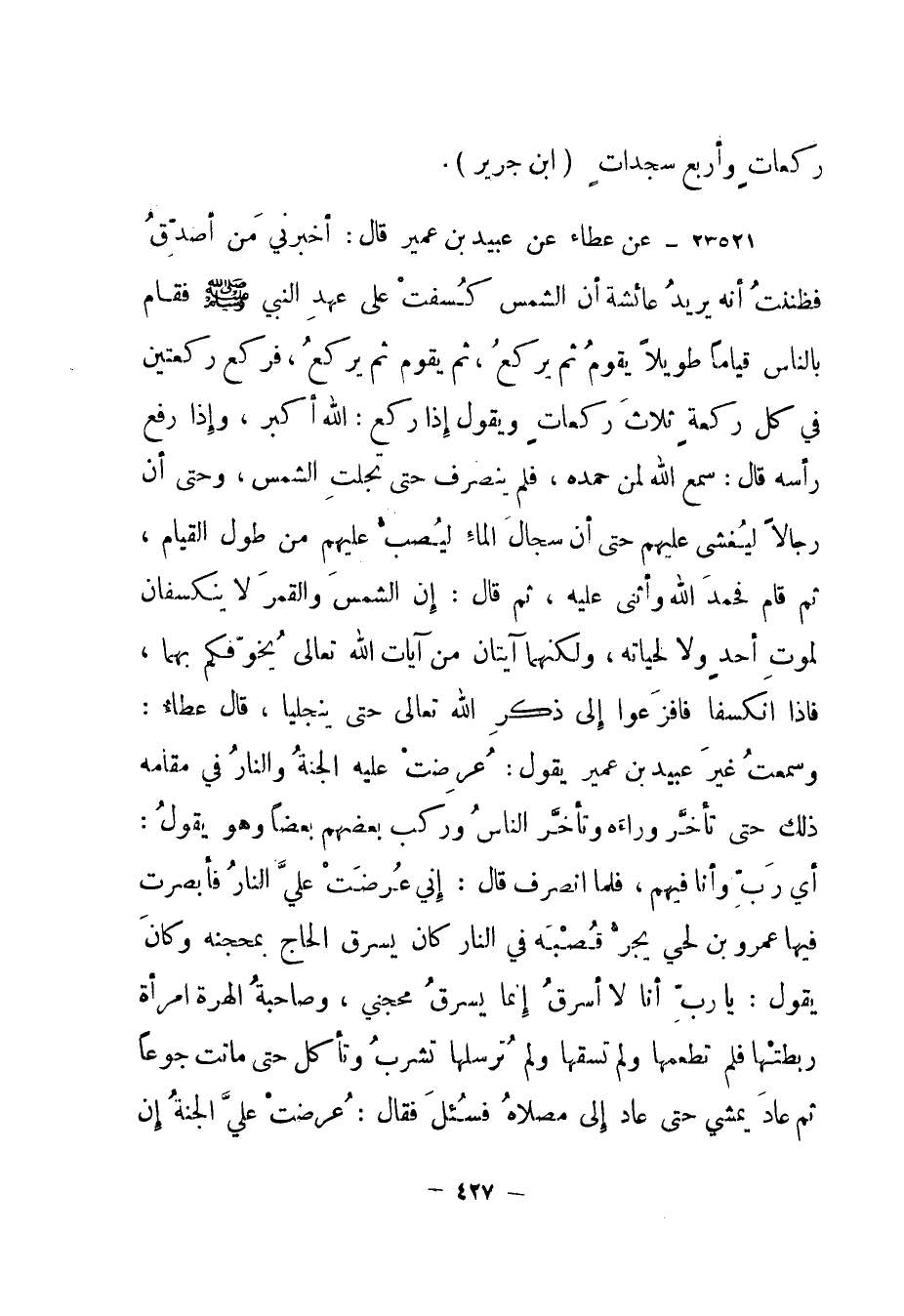 23521- عن عطاء عن عبيد بن عمير قال: "أخبرني من أصدق فظننت أنه يريد عائشة أن الشمس كسفت على عهد النبي صلى الله عليه وسلم فقام بالناس قياما طويلا يقوم ثم يركع، ثم يقوم ثم يركع، فركع ركعتين في كل ركعة ثلاث ركعات ويقول إذا ركع: الله أكبر، وإذا رفع رأسه" قال: "سمع الله لمن حمده، فلم ينصرف حتى تجلت الشمس، وحتى أن رجالا ليغشى عليهم حتى أن سجال الماء ليصب عليهم من طول القيام، ثم قام فحمد الله وأثنى عليه،" ثم قال: "إن الشمس والقمر لا ينكسفان لموت أحد ولا لحياته، ولكنهما آيتان من آيات الله تعالى يخوفكم بهما، فإذا انكسفا فافزعوا إلى ذكر الله تعالى حتى ينجليا،" قال عطاء: "وسمعت غير عبيد بن عمير يقول: عرضت عليه الجنة والنار في مقامه ذلك حتى تأخر وراءه وتأخر الناس وركب بعضهم بعضا وهو يقول: أي رب وأنا فيهم، فلما انصرف" قال: إني عرضت علي النار فأبصرت فيها عمرو بن لحي يجر قصبه في النار كان يسرق الحاج بمحجنه وكان يقول: يا رب أنا لا أسرق إنما يسرق محجني، وصاحبة الهرة امرأة ربطتها فلم تطعمها ولم تسقها ولم ترسلها تشرب وتأكل حتى ماتت جوعا ثم عاد يمشي حتى عاد إلى مصلاه فسئل فقال: عرضت علي الجنة إن