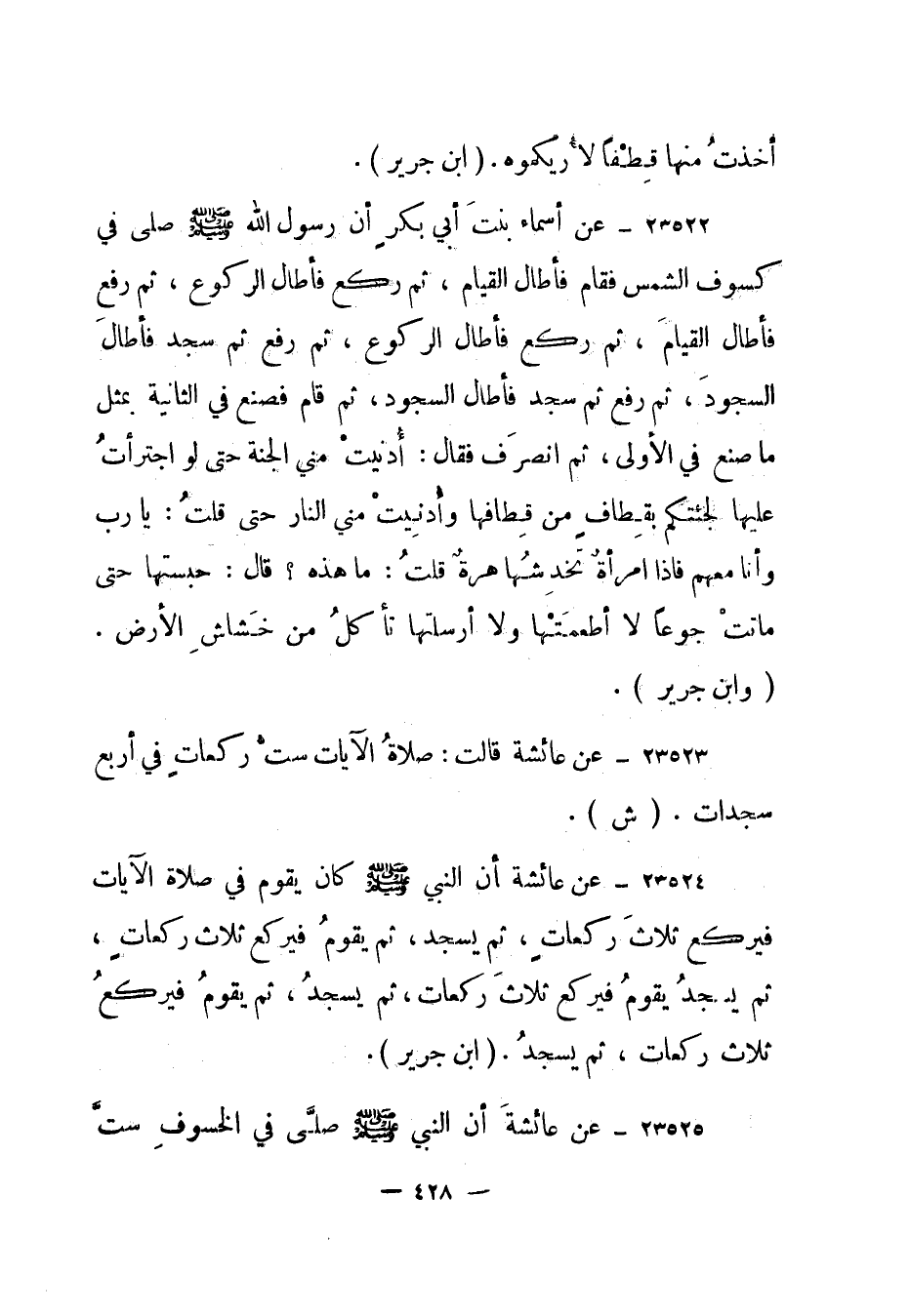 23522- عن أسماء بنت أبي بكر أن رسول الله صلى الله عليه وسلم صلى في كسوف الشمس فقام فأطال القيام، ثم ركع فأطال الركوع، ثم رفع فأطال القيام، ثم ركع فأطال الركوع، ثم رفع ثم سجد فأطال السجود، ثم رفع ثم سجد فأطال السجود، ثم قام فصنع في الثانية بمثل ما صنع في الأولى، ثم انصرف فقال: أدنيت مني الجنة حتى لو اجترأت عليها لجئتكم بقطاف من قطافها وأدنيت مني النار حتى قلت: يا رب وأنا معهم فإذا امرأة تخدشها هرة قلت: ما هذه؟ قال: "حبستها حتى ماتت جوعا لا أطعمتها ولا أرسلتها تأكل من خشاش الأرض". (وابن جرير) .