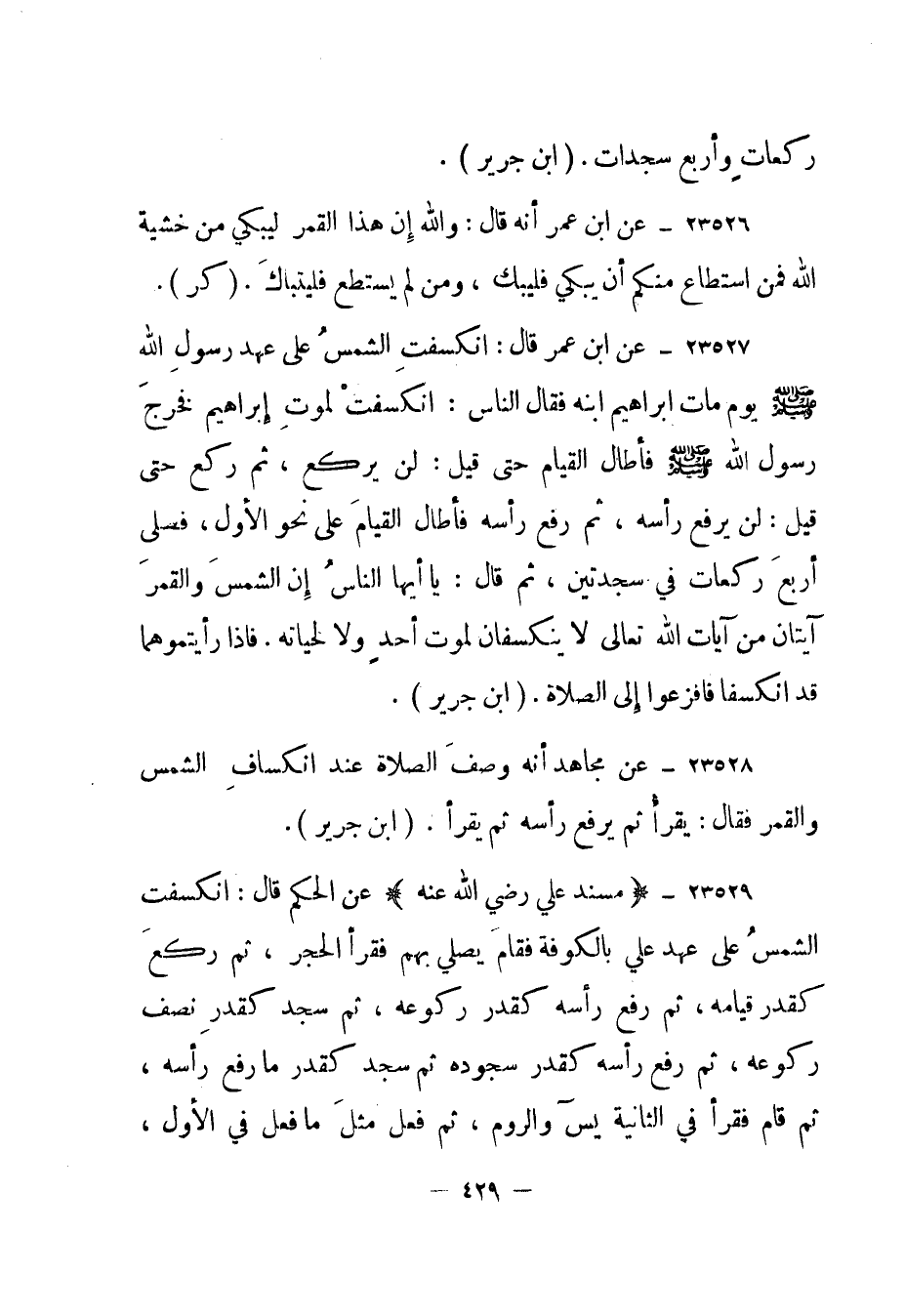 23529- (مسند علي رضي الله عنه) عن الحكم قال: "انكسفت الشمس على عهد علي بالكوفة فقام يصلي بهم فقرأ الحجر، ثم ركع كقدر قيامه، ثم رفع رأسه كقدر ركوعه، ثم سجد كقدر نصف ركوعه، ثم رفع رأسه كقدر سجوده ثم سجد كقدر ما رفع رأسه، ثم قام فقرأ في الثانية يس والروم، ثم فعل مثل ما فعل في الأول،