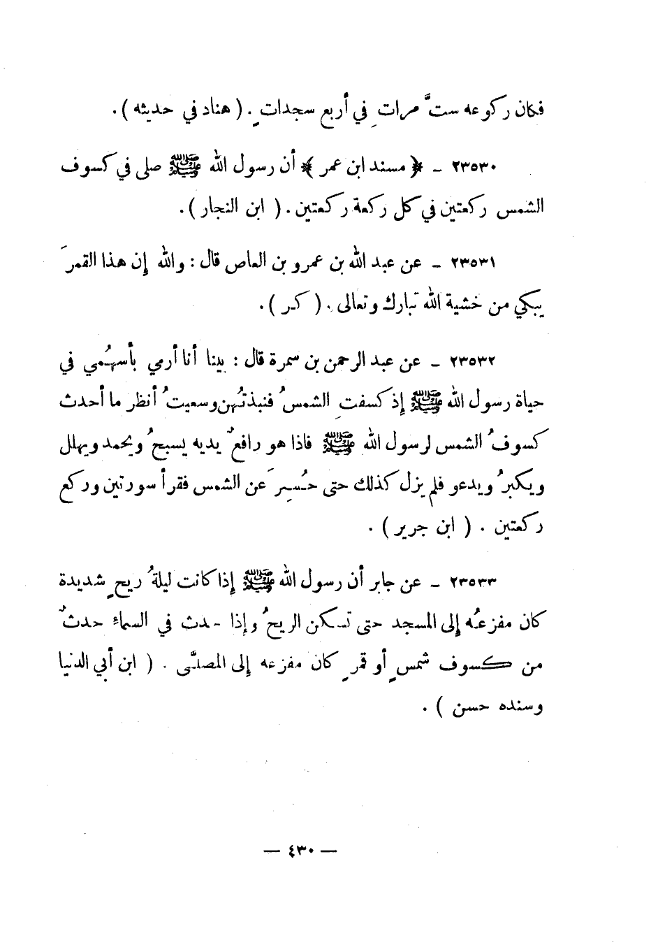 23530- (مسند ابن عمر) أن رسول الله صلى الله عليه وسلم صلى في كسوف الشمس ركعتين في كل ركعة ركعتين. (ابن النجار) .