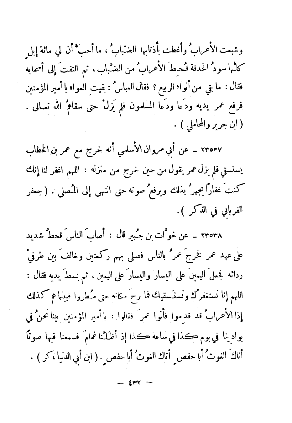 23538- عن خوات بن جبير قال: "أصاب الناس قحط شديد على عهد عمر فخرج عمر بالناس فصلى بهم ركعتين وخالف بين طرفي ردائه فجعل اليمين على اليسار واليسار على اليمين، ثم بسط يديه فقال: اللهم إنا نستغفرك ونستسقيك فما برح مكانه حتى مطروا فبينما هم كذلك إذا الأعراب قد قاموا فأتوا عمر فقالوا: يا أمير المؤمنين بينا نحن في بوادينا في يوم كذا في ساعة كذا إذ أظلنا غمام فسمعنا فيها صوتا أتاك الغوث أبا حفص أتاك الغوث أبا حفص". (ابن أبي الدنيا، كر) .