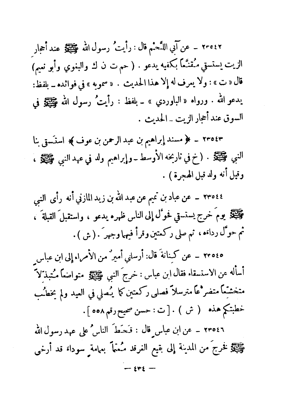 23546- عن ابن عباس قال: "قحط الناس على عهد رسول الله صلى الله عليه وسلم فخرج من المدينة إلى بقيع الغرقد معتما بعمامة سوداء قد ارخى
